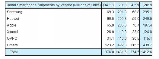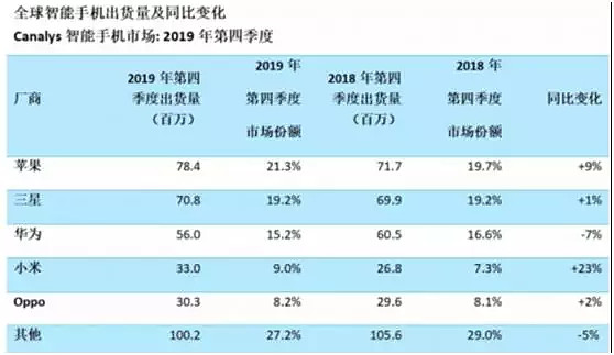下图是【全球智能手机出货量】,小米2019年第4季度的出货量达3300万台,同比增加23%,市场份额占比达9%,超越了去年的OPPO手机,全球排行第四,2019年的出货量达1.248亿台,同比增长4.6%。