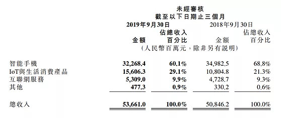 智能手机很好理解,主要是小米手机和红米手机的各个机型,2019年3季度手机的营业收入323亿,同比去年减少了7.8%,占总收入的比重由去年68.8%下降至60.1%。