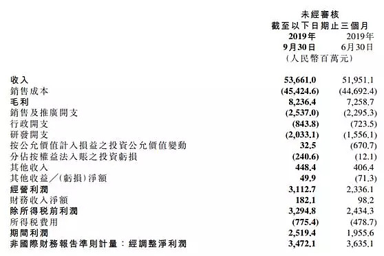 2019年3季度小米的总收入536.6亿,同比去年增加5.5%,销售成本454亿,同比去年增加了2.6%,经调整净利润为34.7亿,同比去年的28.85亿增加了20%。