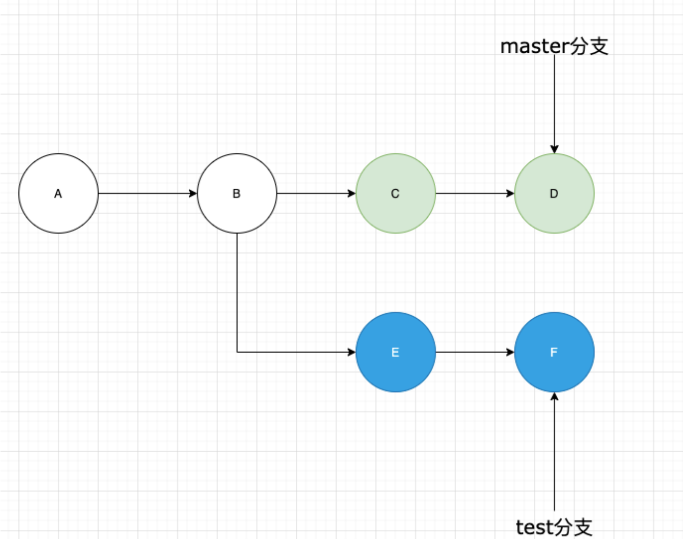 如上图所示,我们有两个分支,master分支和test分支,test分支是基于master分支在B处的提交节点创建的,在创建后master分支又经过迭代提交了两次,从C到D节点,test分支也基于B往前继续更新了两次,到了F节点。两者从B开始就走向了分叉。