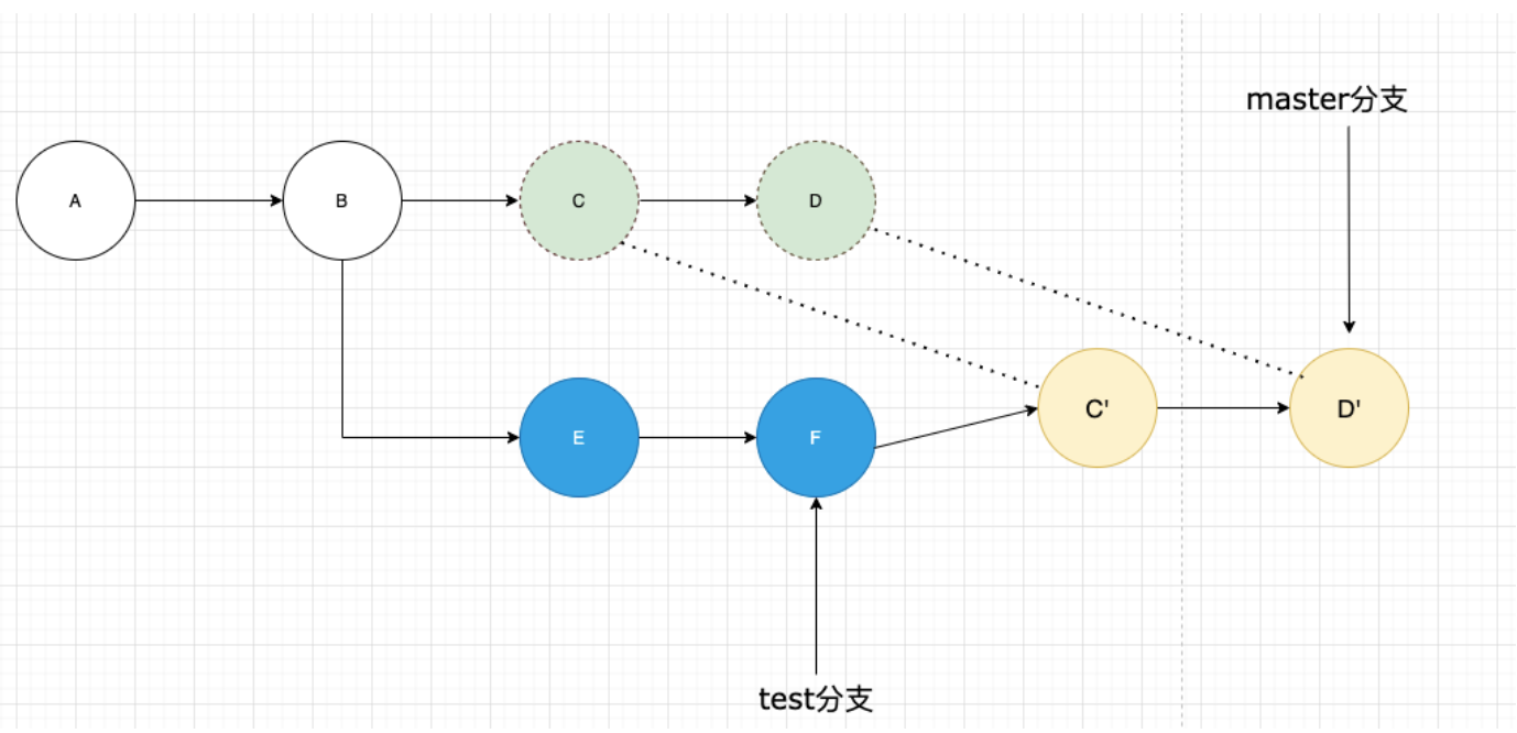我们结合具体例子来说明,当我们在master (待变基分支)上执行git rebase test(基分支)时,git就会从两者的共同祖先B开始,提取master分支上的修改,也就是C,D两个commit,提取到之后git会先保存起来,然后将master分支指向test分支最新提交的节点,也就是F节点,然后把提取到的C,D接到F后面,在这个过程当中,会删除原来的C,Dcommit记录,生成新的C‘,D',虽然C',D'和原来的C,Dcoommit的内容是一样的,但是commit id是不同的。