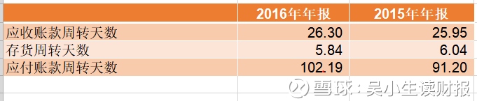 根据2016年报中披露的数据,经过我的计算,苹果公司的应收账款周转天数为26天,存货周转天数6天左右。应付账款周转天数102天。