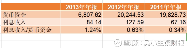 2011-2012年公司账面上都躺着2亿元左右的现金,通过上述的方法,同样可以计算出这两年利息收入/货币资金的平均比值只有0.48%,远远低于7天通知存款利率,属于异常。因此你马上可以质疑它的现金乃至收入都是虚构的。