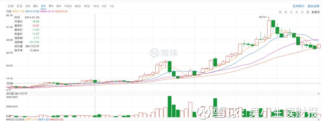 这家公司的股价也从2014年初的13块钱涨至2017年底的58块钱,涨幅超过400%,如果你对这些财务指标的理解足够深,从指标的显著变化发现机会,并再从经营和行业层面的角度来交叉验证,不说4倍,享受股价翻倍的财富增值显然是可以轻松抓在手里的。