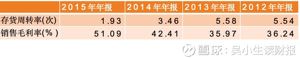 然后,下面的表格里的第二家公司,这家公司的毛利率一直稳定在90%左右,当时由于一些“特殊的原因”,对它的业绩打击很大。从数据中可以看出这家公司的存货周转率从2011年的0.24一路下滑到2015最低的0.15,股价也从2012年底短短1年的时间接近腰斩。
