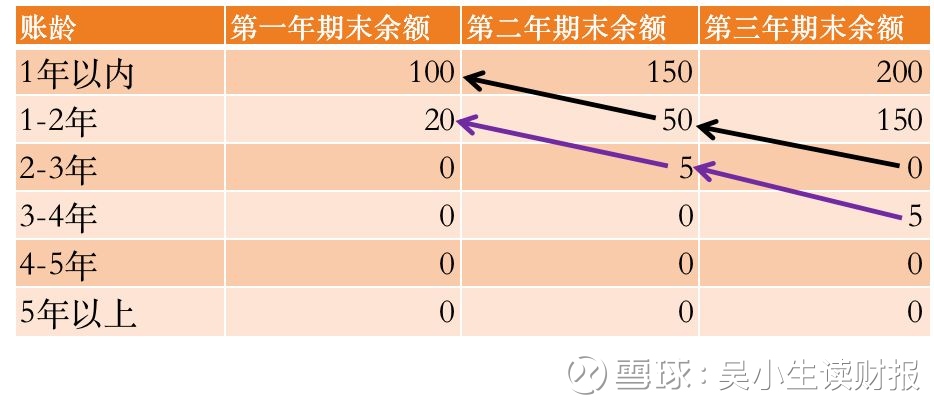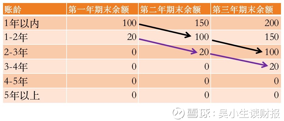 如果老王在第二年归还了50万,那么在期末,就只要把另外的50万划分到“1-2年”里面去就行了。同样的道理,现在我们反过来想,如果我们现在整理了生叔包子铺在财报当中披露的账龄表数据,如下图所示。