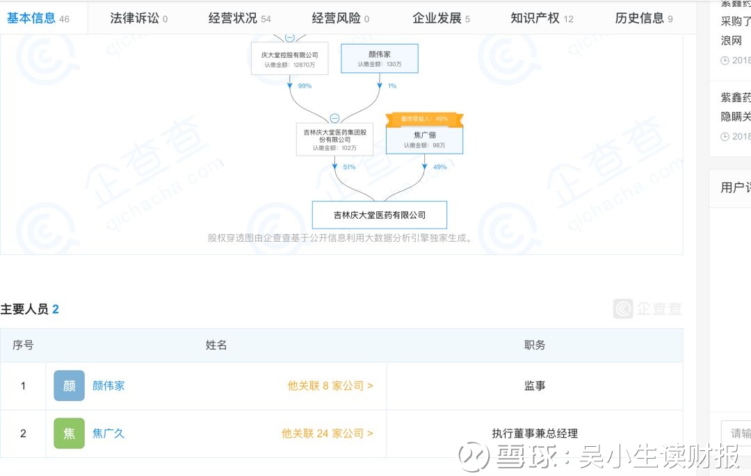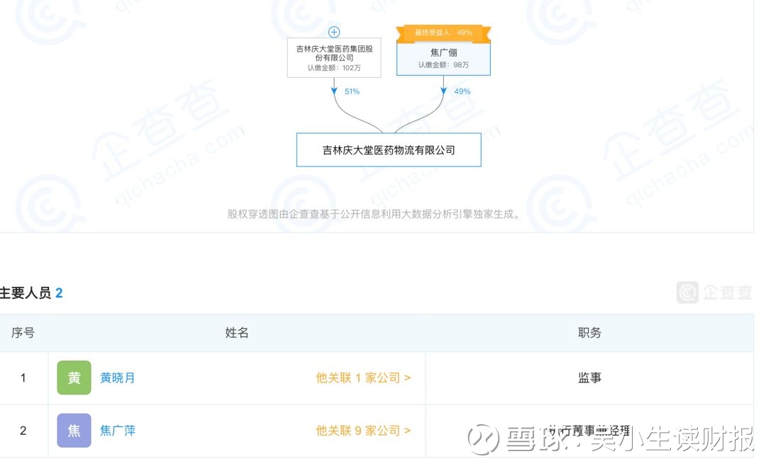 其中,它2016年的第一大客户叫【吉林庆大堂医药有限公司】,要深挖它,就要先查清楚它背后主要的股东都是谁。