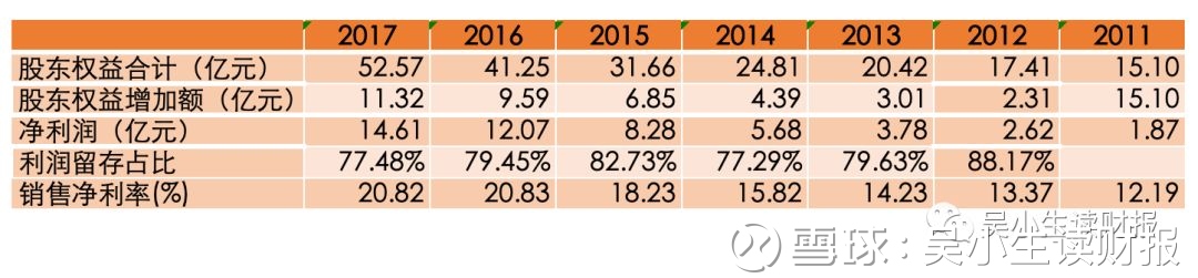随着高端产品上市后市场出现井喷,供不应求,公司的销售净利率也从最底的10.91%提升至2017年的20%以上。与此同时,公司上市以来没有进行过定向增发,这一点非常难得。公司每年会将获得的利润中接近80%直接留存在公司里进行再投入,当销售净利率的提升驱动着ROE的不断抬升,这种每年通过内部再投资的方式无疑创造了越来越大的价值。