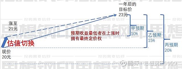 接下来,甲乙的买盘将股价推升至20.5元,此时的预期收益降至12%,已经低于乙的预期收益要求,高于甲。于是,乙停止买入,甲继续买,一直买到21元,预期收益低于10%,甲也停止。