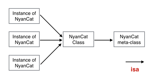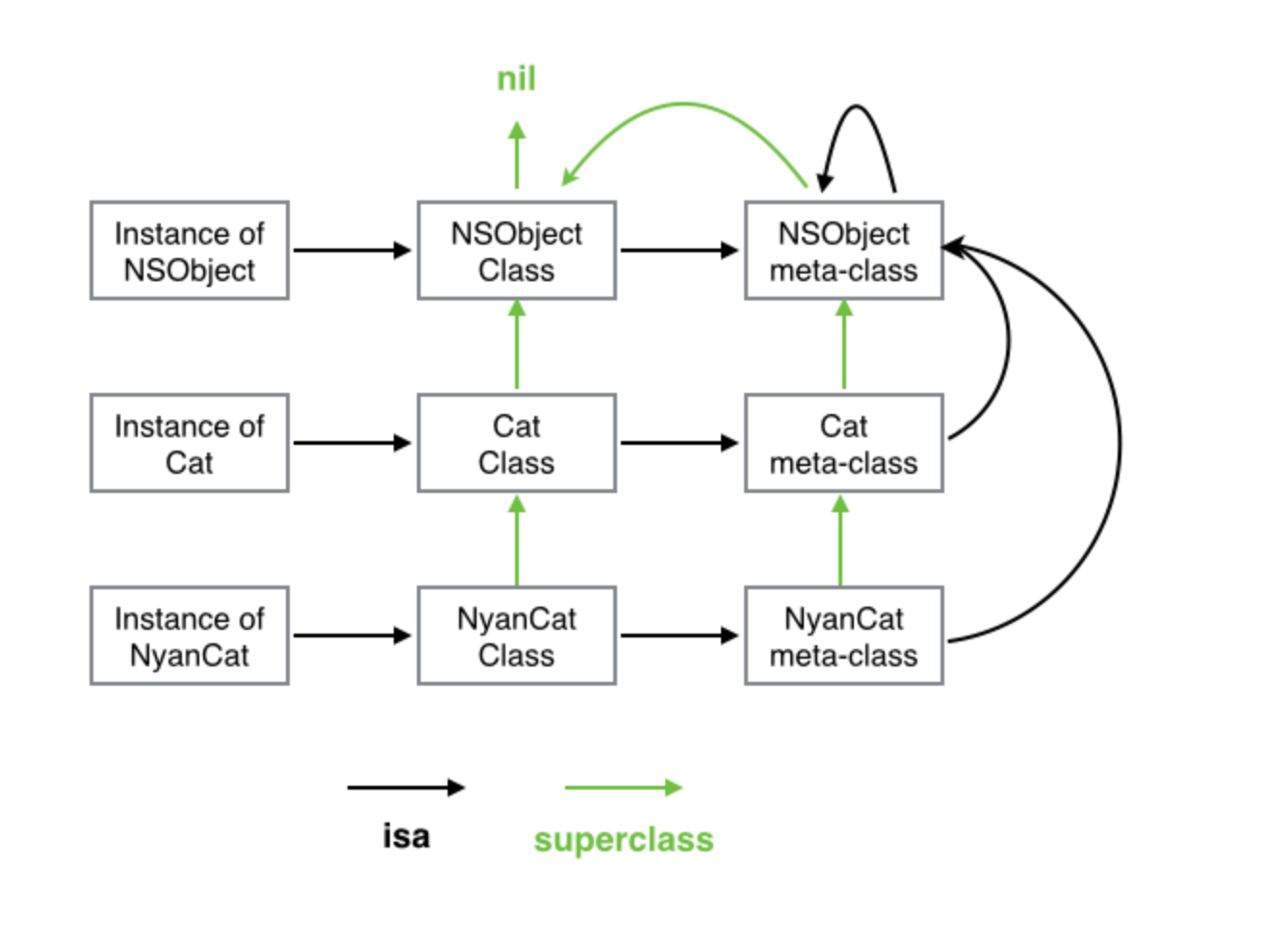 为了说明方便,这里把上面的例子稍微改一下:NyanCat : Cat : NSObject 这样一个继承树,画出图来就是这样子的