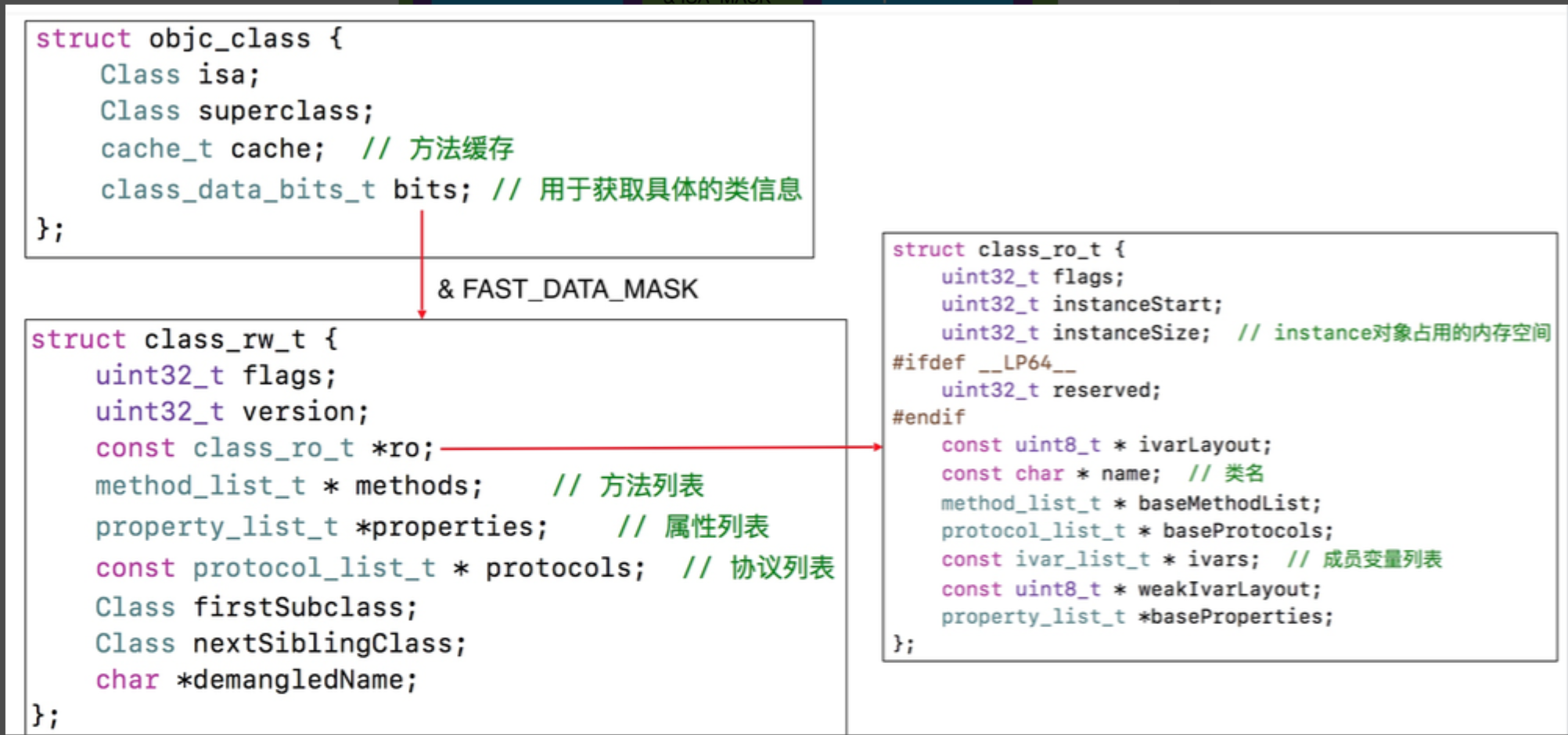 在_class_t里面,第二个成员是superclass,很明显这个指针指向了它的父类。运行时可以通过isa和superclass获取一个类在继承树上的完整信息。