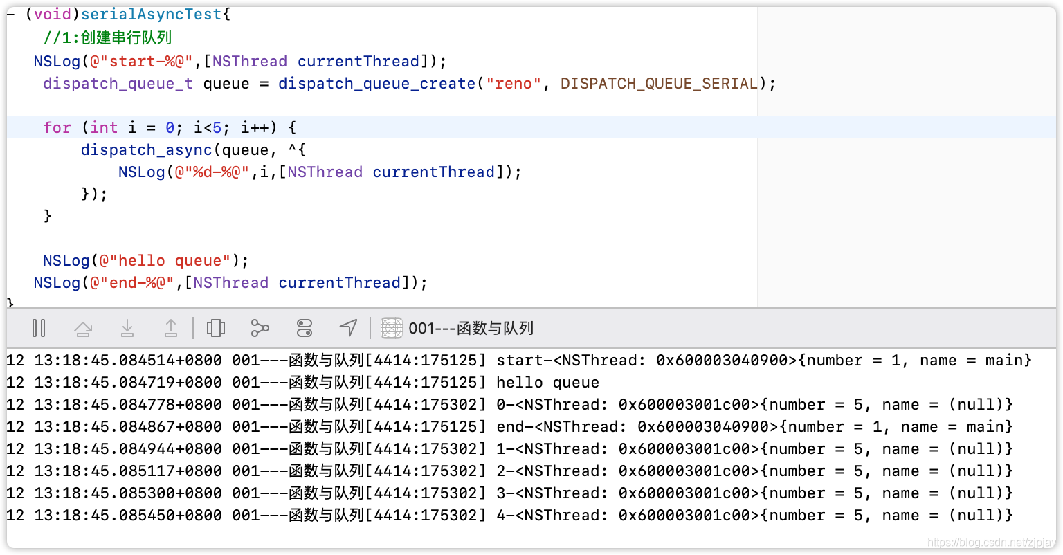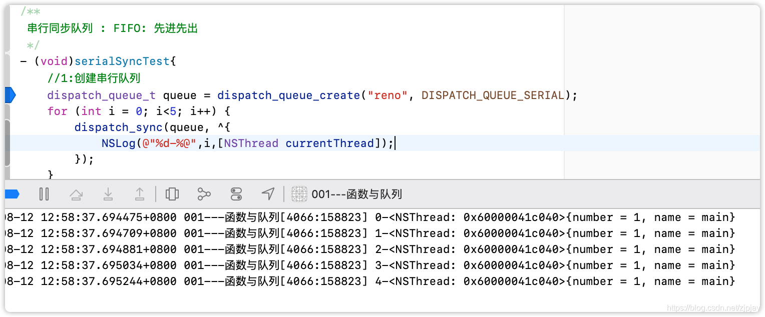 如果队列中存放的是同步任务,则任务出队后,底层线程池中会提供一条线程供这个任务执行,任务执行完毕后这条线程再回到线程池。这样队列中的任务反复调度,因为是同步的,所以当我们用currentThread打印的时候,就是同一条线程。