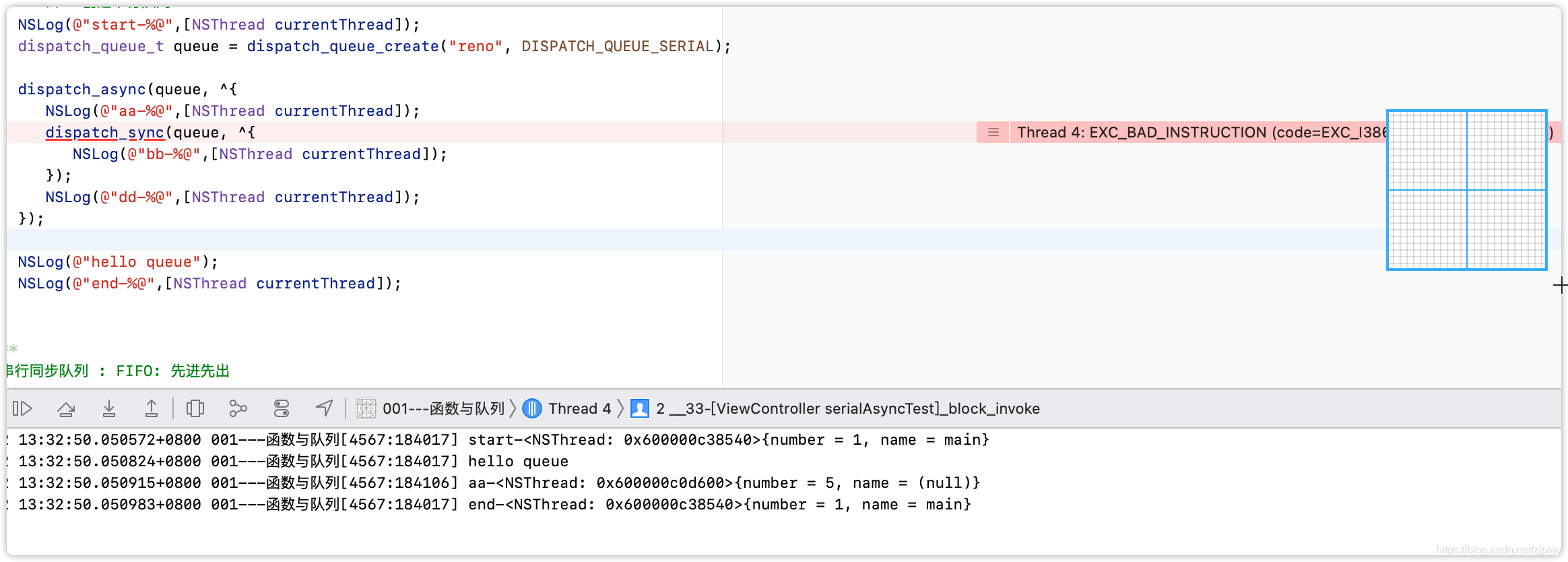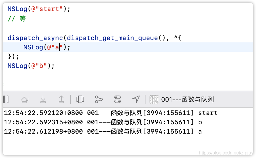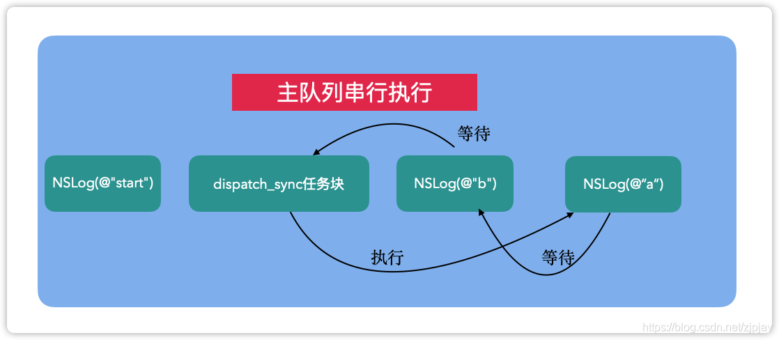 NSlog(@"start") --> dispathc_sync任务块 --> NSlog(@"b") 在执行任务块时,会向主队列添加一个任务NSlog(@"a"),NSlog(@"a")需要等到NSlog(@"b")执行完成后才能执行,而NSlog(@"b")又要等dispathc_sync任务块执行完成才会执行。这样主队列就会进入一个互相等待状态,这样就是死锁