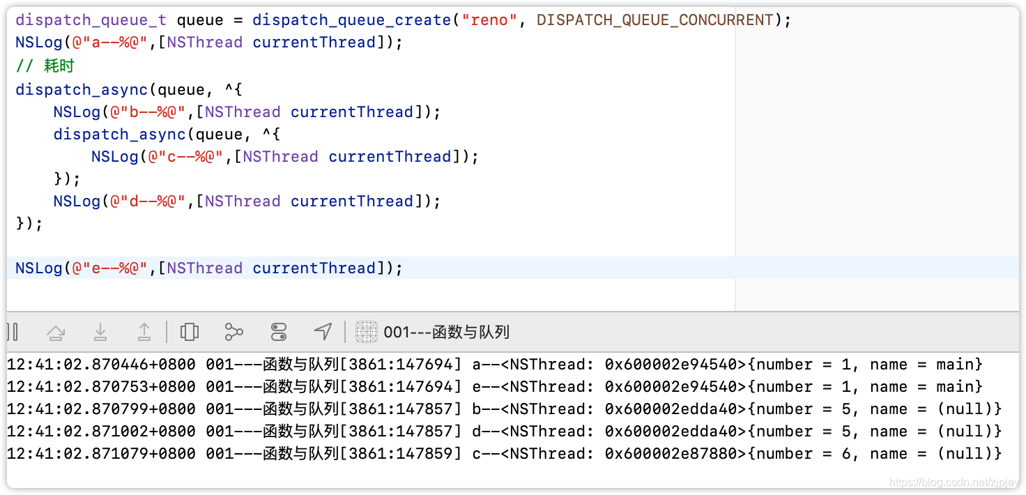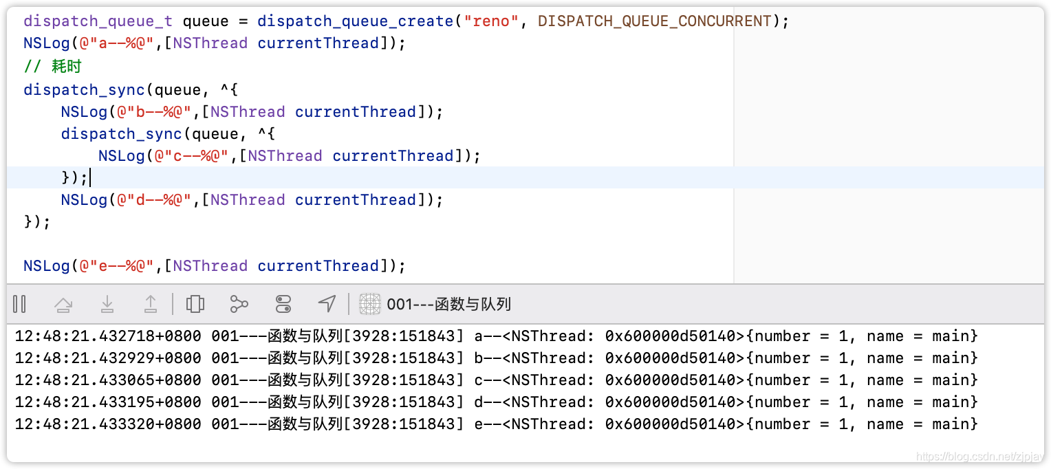 虽然队列是并发的,但是函数是同步,所以任务就是顺序执行,所以打印顺序为:a-b-c-d-e,同步还是不开启线程