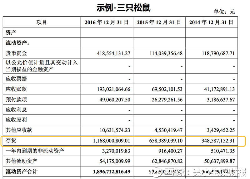 首先,在看资产负债表时,我们要先理解一家企业资产的构成。 一家企业资产构成的特征又主要受到了以下两个因素的影响: (1)所处行业与商业模式 (2)在产业链中的地位 先说第一点,从行业层面来看,不同的行业对应着不同的资产内部结构的占比。 就比如,下面是三只松鼠的资产负债表,请问你注意到了什么?体现了快消食品行业的什么特点?