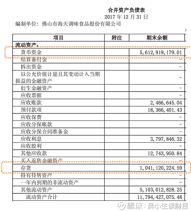 在三只松鼠的报表里,我们可以看到货币资金和存货这两项的占比非常大,这是因为我们都知道快消行业主要都是面对普通的消费者,这些消费者通常都是直接以付现的形式进行购买,所以一般体现出非常好的现金流。 此外,快消行业会储备较多的存货来保证整个供应体系正常运转,所以它的存货也是非常大的。 打开海天味业的资产负债表,你也会发现其资产的结构与三只松鼠非常类似。