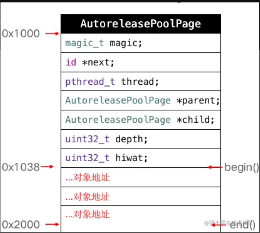 id *next;//指向下一个即将产生的autoreleased对象的存放位置(当next == begin()时,表示AutoreleasePoolPage为空;当next == end()时,表示AutoreleasePoolPage已满