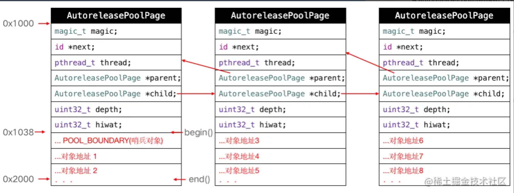 当不断的创建对象时,AutoreleasePoolPage不断存储对象地址,直到存满后,则又会创建一个新的AutoreleasePoolPage,使用child指针和parent指针指向下一个和上一个page,从而形成一个双向链表,对象地址存储的顺序如图所示。