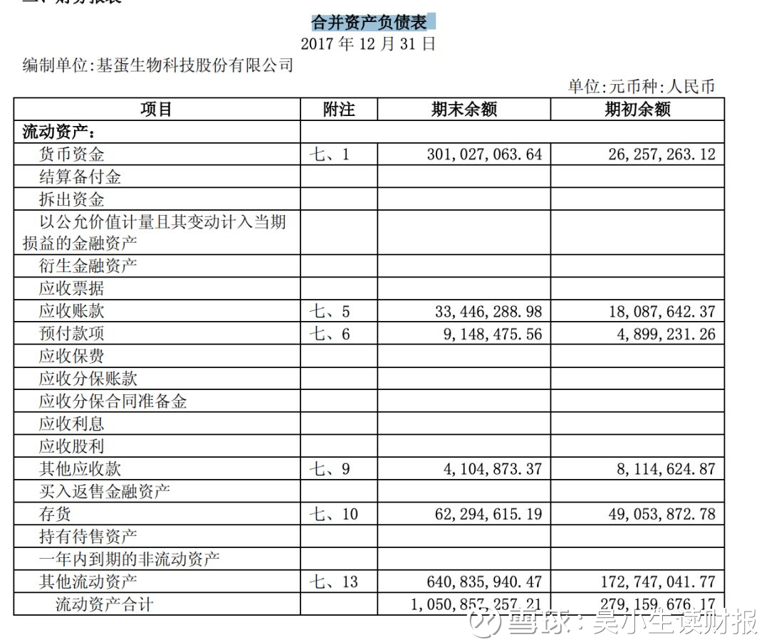 下面是生叔之前写过的一家公司,基蛋生物的合并资产负债表,账面金额比较大的都是涉及日常经营的那几个报表项目,非常干净。