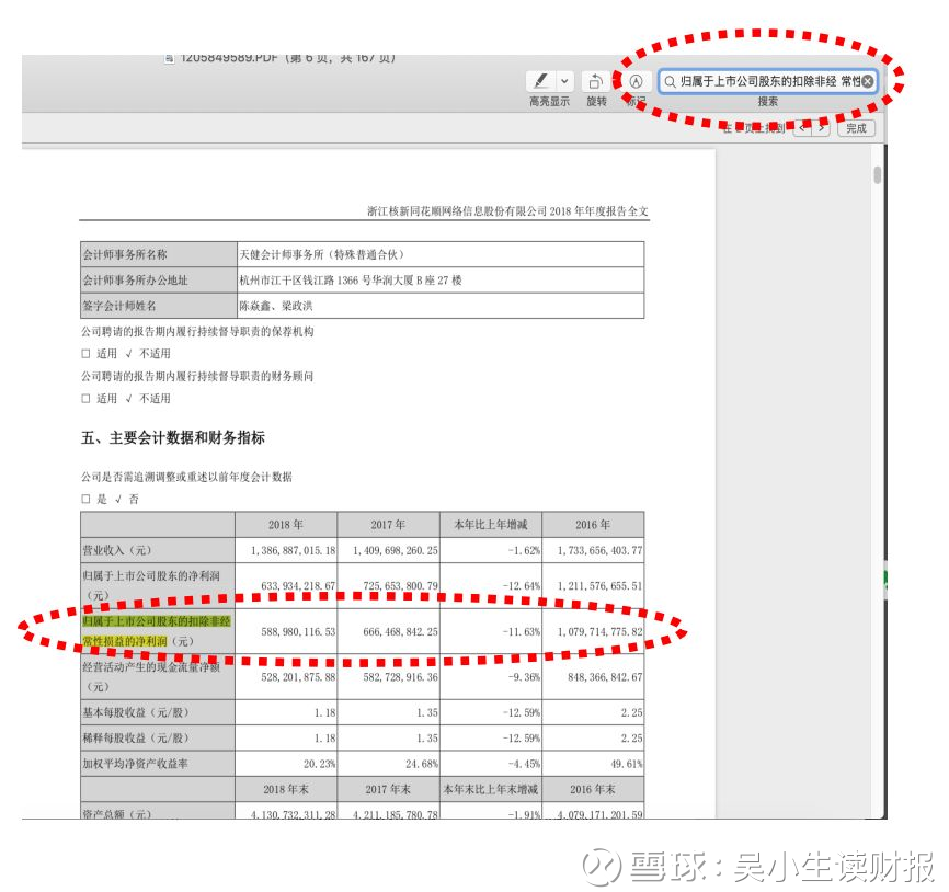 常用的方式有两种,一种是叫做扣非净利润,按照披露要求,它会直接在年报里面披露(不用我们自己去算),你只需要用好我们介绍的Ctrl+F全文查找快捷键,直接在年报的PDF文件里搜索“扣除非经常性损益的净利润”这几个字就行啦。甚至可以再简单一点,直接搜索“扣除”